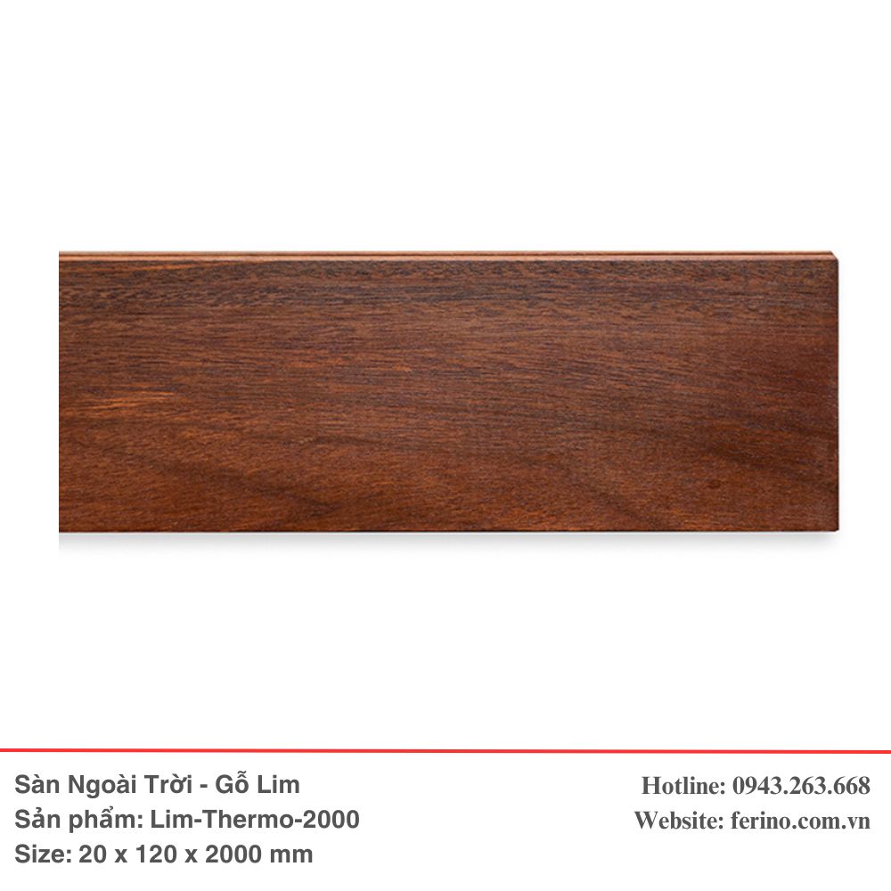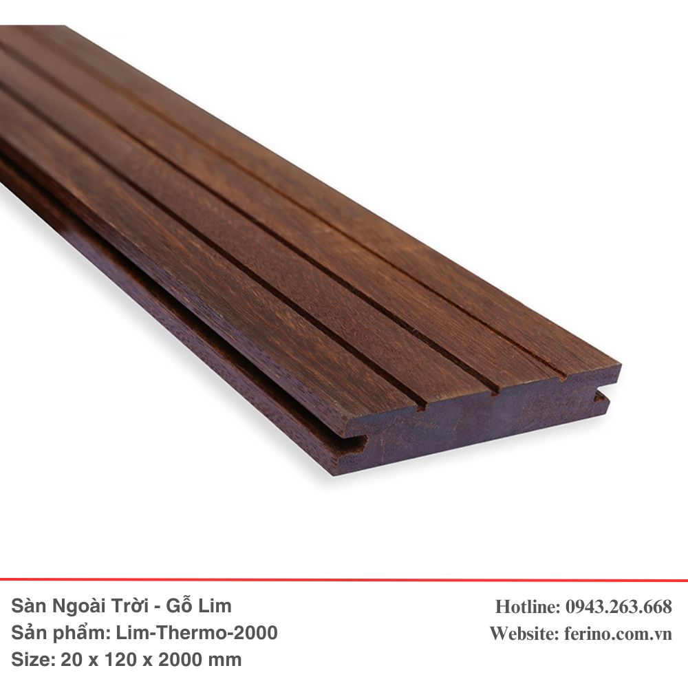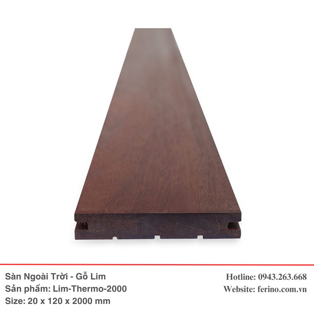 Sàn ngoài trời gỗ Lim biến tính nhiệt (Lim nung) là dòng vật liệu ngoại thất siêu cấp, đại diện cho sự kết hợp giữa dòng gỗ nhóm I quý hiếm và công nghệ xử lý nhiệt 210°C tiên tiến. Qua quá trình xử lý nhiệt độc quyền, các thành phần đường và độ ẩm trong gỗ Lim được triệt tiêu, giúp thanh gỗ đạt đến độ ổn định lý tưởng. Sản phẩm sở hữu tông màu nâu sẫm sang trọng, quý phái, là điểm nhấn hoàn hảo cho những không gian kiến trúc cao cấp, yêu cầu sự trường tồn cùng thời gian.